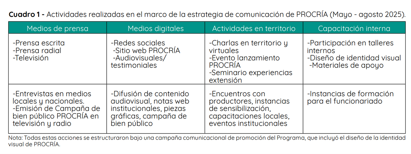 Entre las diferentes acciones, se destaca la campaña de bien público implementada, no solo para favorecer los objetivos respecto a los destinatarios de PROCRÍA, sino también para dar a conocer a la ciudadanía una política de Estado pensada como tal y que tiene como centro el sector primario de nuestra economía y a sus trabajadores. Pero un programa de asesoramiento técnico y extensión rural necesita el contacto directo con la gente, y es aquí donde los equipos técnicos de las instituciones que ejecutarán PROCRÍA han demostrado sus aptitudes de extensionistas, realizando más de 100 actividades públicas en todo el territorio nacional. Esto se ha logrado mediante charlas abiertas organizadas para este fin o interviniendo en jornadas técnicas organizadas junto a otras instituciones. En el mismo marco se destaca la participación en las Mesas de Desarrollo Rural, Consejos Agropecuarios Departamentales y organizaciones de productores. Estas mismas actividades también se realizaron para jóvenes y las gremiales que los nuclean, mediante intercambios y transmisiones a través de las plataformas Zoom y Youtube.