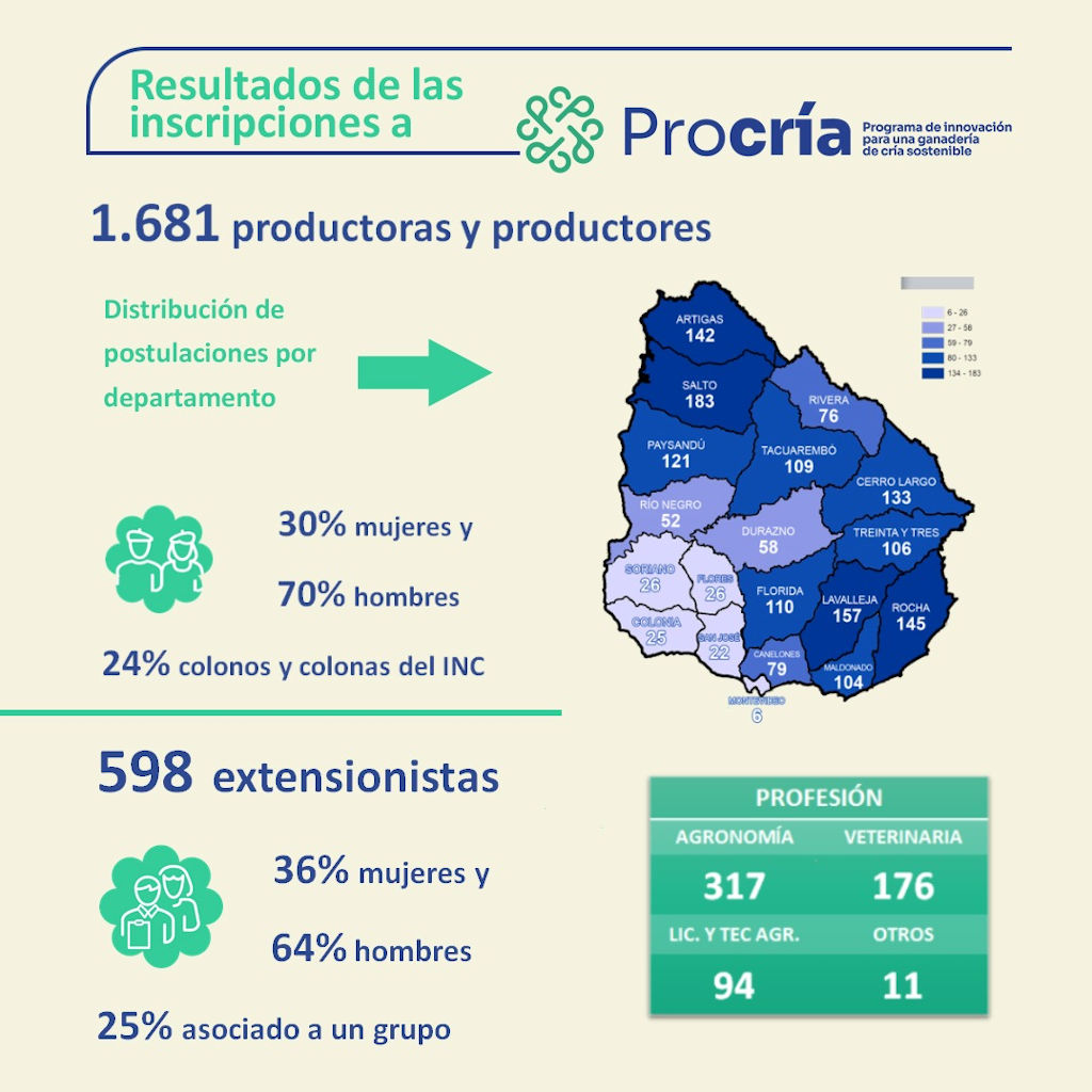 La ganadería de cría es uno de los pilares del sector agropecuario uruguayo. Genera más del 40 % del producto bruto agropecuario, emplea a decenas de miles de personas y ocupa un rol clave en la conservación del campo natural (MGAP, 2023). Sin embargo, desde hace décadas enfrenta limitaciones productivas, económicas y ambientales que pueden ser mejorables, buscando la sostenibilidad predial familiar y mayores ingresos para el país. En este contexto, el Programa de I nnovación para una Ganadería de Cría Sostenible, PROCRÍA, surge como una iniciativa interinstitucional para promover sistemas de cría más productivos, resilientes y ambientalmente responsables, con énfasis en la producción familiar y en la participación de mujeres y jóvenes. El Programa es una iniciativa interinstitucional coordinada por el Ministerio de Ganadería, Agricultura y Pesca (MGAP) y el Instituto Plan Agropecuario (IPA). Participan del programa, el Instituto Nacional de Investigación Agropecuaria (INIA), el Instituto Nacional de Carnes (INAC), el Instituto Nacional de Colonización (INC), la Universidad de la República (Udelar), el Secretariado Uruguayo de la Lana (SUL), y el Banco Mundial (BM).